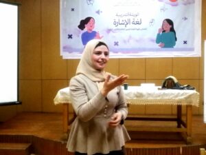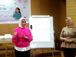 وقد أشارت الأستاذة عزة عبد الظاهر مسئول التمكين الثقافي ببني سويف في أولى المحاضرات أن لغة الإشارة هي لغة تترجم المشاعر والأفكار بلغة الجسد فليس كل الكلام يُعبر عنه بالصوت ،وأنها لا تنحصر على الأبجدية الإشارية، بل هي قليلة الاستعمال في مجتمع الصم فهم يستخدمونها بكثرة عن استخدامهم للحركات الوصفية .