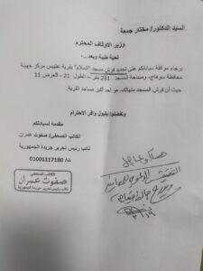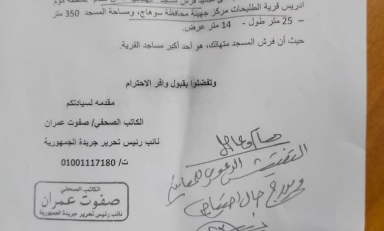 توجه أهالى مركز جهينة بسوهاج بخالص الشكر والتقدير للكاتب الصحفى الاستاذ صفوت عمران ، نائب رئيس تحرير جريدة الجمهورية لمجهوده فى توفير الفرش اللازم ( السجاد ) لعدد من المساجد بجهينة ، والتى كانت من ضمن 57 مسجدا تقرر افتتاحهم الجمعة القادمة 24 من مارس الجارى كان قد تم إحلالها وتجديدها ضمن خطة الوزارة ، وجاء بيان هذه المساجد فى مركز جهينة كالٱتى : مسجد ٱل هدية بقرية عنيبس ، ومسجد الهمامية بالطليحات ، ومسجد السلام بعنيبس ، يذكر أن رواد هذه المساجد ناشدوا الكاتب الصحفى صفوت عمران للحصول على موافقة وزير الأوقاف بفرش هذه المساجد ، وهو ماحدث بالفعل بعد توفيق الله وفضله .